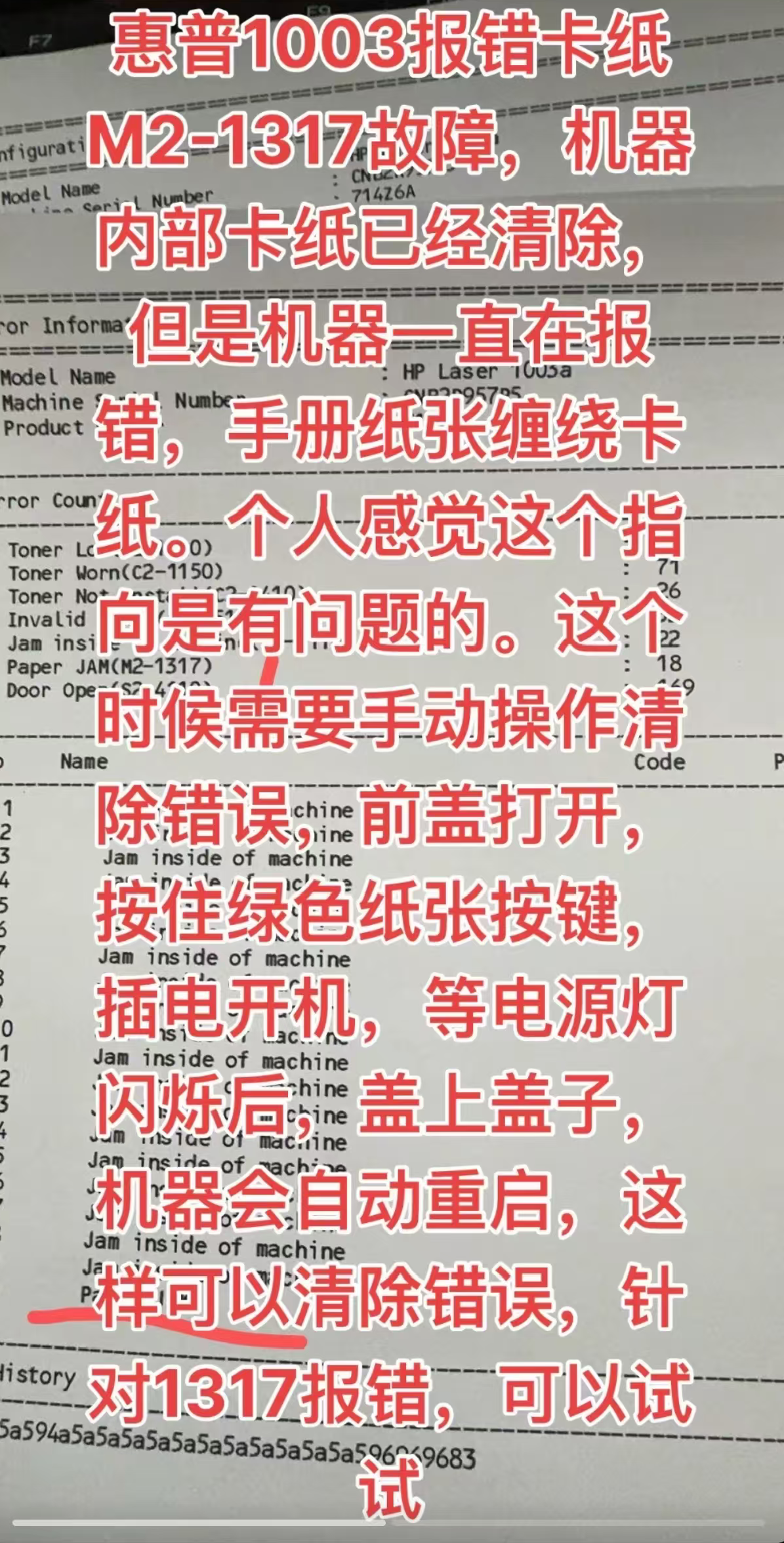 其实代码在官方维修手册里表示卡纸错误,登录web页面也提示是卡纸,但是拆看打印机查看没发现任何卡纸,是不是很迷茫,后来查找各种资料,后来还准备换主板,最后找到了解决方法。